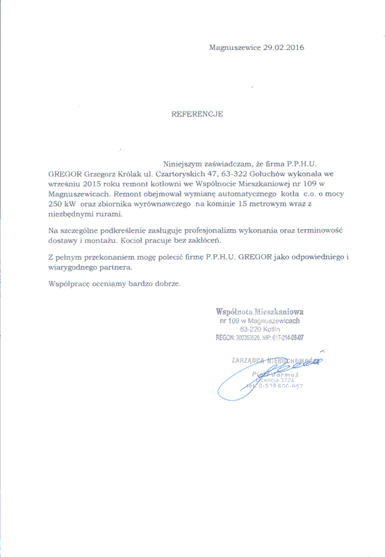 oraz innych urządzeń grzewczych jest na wysokim poziomie, o czym świadczą liczne pochwały i referencje otrzymywane zarówno od instytucji jak i klientów indywidualnych posiadających nasze produkty.Wychodząc naprzeciw Państwa oczekiwaniom firma nasza prowadzi kompleksową obsługę od zamówienia, pomiaru kotłowni, doradztwa, poprzez transport, montaż i uruchomienie